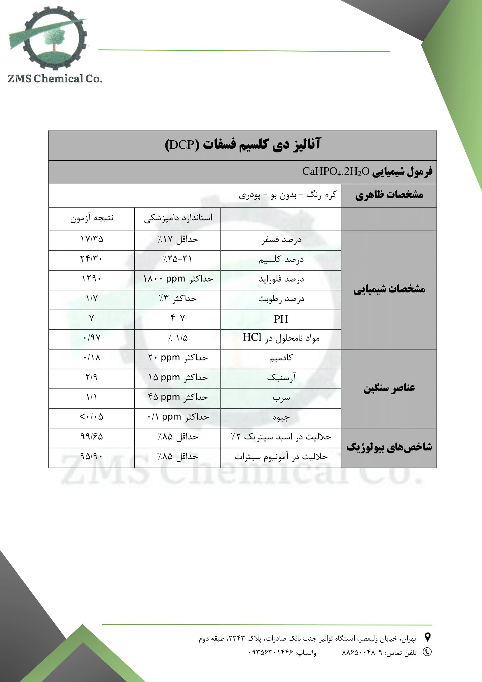 در صنعت این محصول به دو شکل گرانول و پودری به رنگ سفید تولید میشود. هر 100 گرم DCP تولیدی این شرکت حداقل حاوی 21 گرم کلسیم و 17 گرم فسفر میباشد. این دو عنصرکلسیم و فسفر نقش مهمی را در واکنشهای بیوشیمیایی و متابولیکی (نظیر رشد و استحکام استخوان، تولید مرغ و تخم مرغ و فعالیتهای صحیح دستگاه گوارش) در بدن دام و طیور بر عهده دارند.