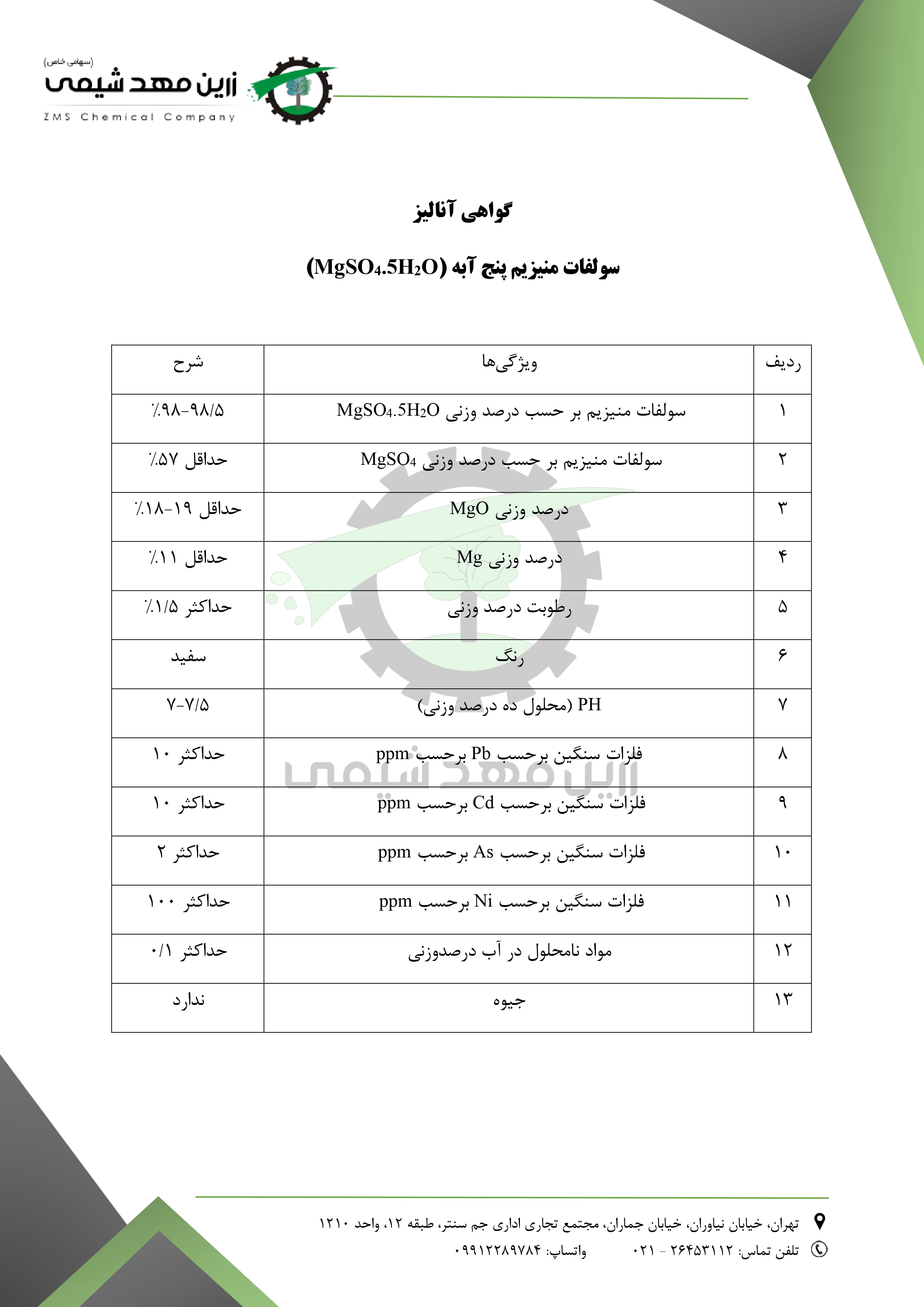 برای تأمین منیزیم سولفات مورد نظر خود، به زرین مهد شيمي اعتماد كنيد. محصول ما با بالاترين استانداردهای كيفيت تولید شده و دسترس مشتریان عزیز است. بنابراین پیشنهاد میکنیم جهت اطلاع از قیمت بروز محصول، با ما تماس گرفته و یا از طریق فرم زیر اطلاعات خود را ارسال کنید تا در کمترین زمان ممکن کارشناسان شرکت با شما ارتباط بگیرند و همکاری موفقی را در کنار هم تجربه كنيم.