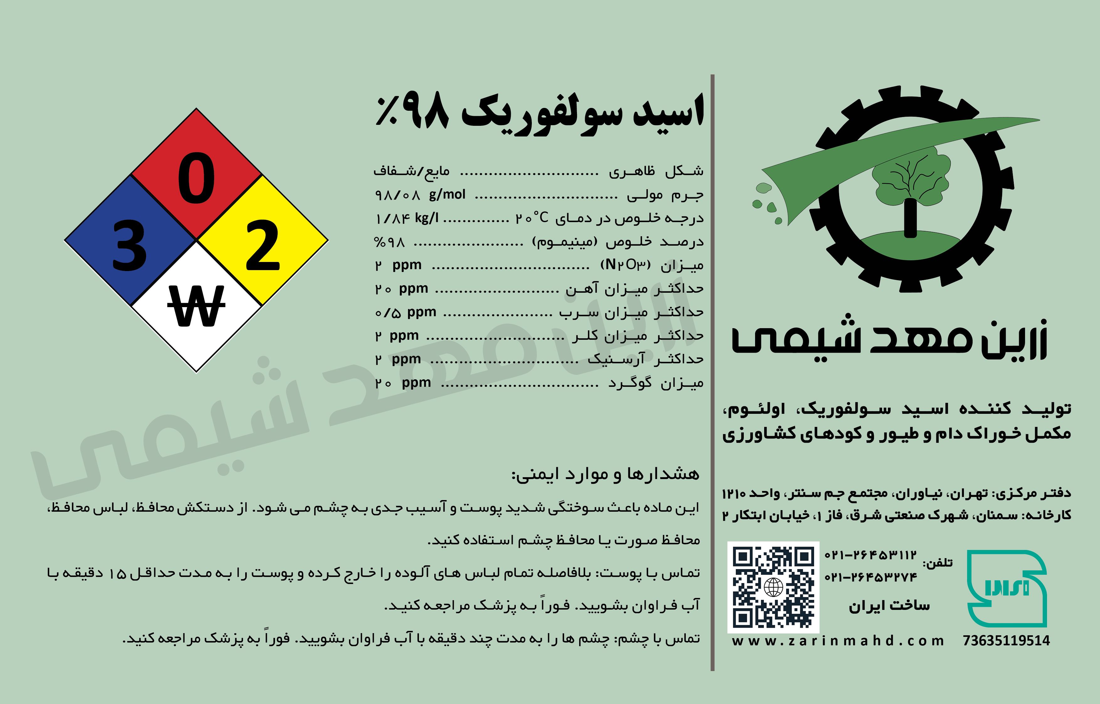در زرین مهد شیمی، ما اسید سولفوریک 98% را که برای گستره وسیعی از کاربردهای صنعتی مناسب است، ارائه می‌دهیم. از هر 100 گرم محلول اسید سولفوریک، 98 گرم آن اسید و 2 گرم آن آب است. این اسید یک مایع بی رنگ، بی بو است که در آب حل شده و یک اسید معدنی قوی و خورنده.